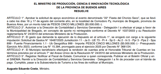 La resolución 379-MPCEITGP-2025, firmada por el ministro de Producción, Ciencia e Innovación Tecnológica, Augusto Costa, y publicada en el Boletín Oficial el 24 de septiembre, provocó críticas inmediatas debido a que se autoriza a enviar 5 millones de pesos para la fiesta que ya había sido realizada los días 16 y 17 de agosto en Bragado.