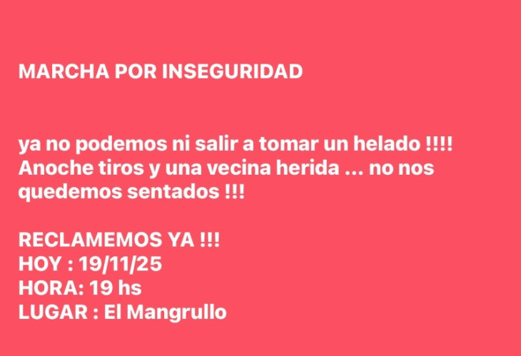 Este suceso y la seguidilla de hechos de violencia e inseguridad, entre los que se destacaron brutales entraderas en horas de la madrugada, los vecinos de Ciudad Evita se autoconvocaron para la noche de hoy miércoles. La manifestación es para visibilizar lo que ocurre en los barrios y reclamar, al municipio y la provincia, presencia policial en las calles y durante las 24 horas.