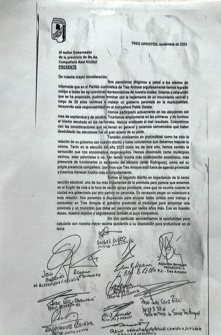 La nota, que incluye la firma de referentes de movimientos ligados al intendente Pablo Garate, ratifica el amplio consenso dentro del peronismo de Tres Arroyos sobre la necesidad de un cambio de trato por parte de La Plata.