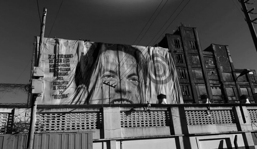 "De las revoluciones del pasado a los desafíos del mañana. Berisso y Ensenada hermanadas para reconstruir el futuro de Argentina", es el mensaje que se inscribe a un costado del rostro gigante de Kicillof.