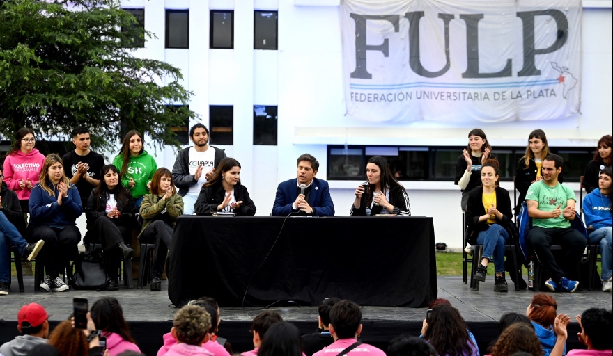Este martes el gobernador de la Provincia de Buenos Aires, Axel Kicillof, participó de un encuentro en defensa de las universidades públicas y en rechazo al veto de la Ley de Financiamiento Universitario en el predio EX BIM III de la Universidad Nacional de la Plata junto a las presidentas de la Federación Universitaria de La Plata (FULP), Sol Alconada y Albertina Bidart.