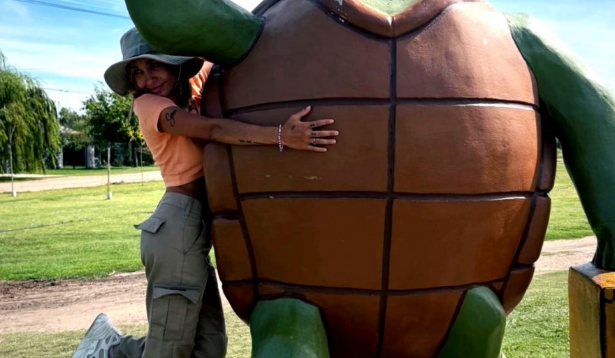 Esta semana la artista María Becerra visitó el Parque Ambiental Manuelita de Pehuajó, el icónico espacio que rinde homenaje a la emblemática tortuga creada por María Elena Walsh. Alli, la cantante quilmeña se sacó fotos en la escultura ubicada en el acceso al Aeródromo.