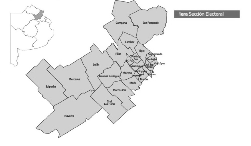 En este territorio, irán a las urnas 5.131.861 de electores, en una sección que comprende a los municipios de Campana, Escobar, Gral. Las Heras, Gral. Rodríguez, Hurlingham, Ituzaingó, José C. Paz, Luján, Malvinas Argentinas, Marcos Paz, Mercedes, Merlo, Moreno, Morón, Navarro, Pilar, San Isidro, San Fernando, San Martín, San Miguel, Suipacha, Tigre, Tres de Febrero y Vicente López.
