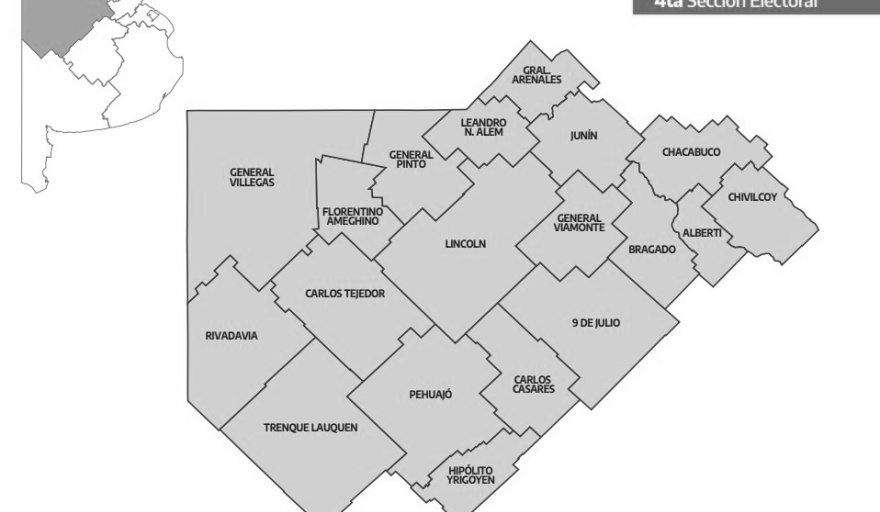 En la Cuarta Sección Electoral irán a las urnas 547.677 electores y los municipios que componen este territorio son Alberti, Bragado, Carlos Casares, Carlos Tejedor, Chacabuco, Chivilcoy, Florentino Ameghino, General Arenales, General Pinto, General Viamonte, General Villegas, Hipólito Yrigoyen, Junín, Leandro N. Alem, Lincoln, Nueve de Julio, Pehuajó, Rivadavia y Trenque Lauquen.