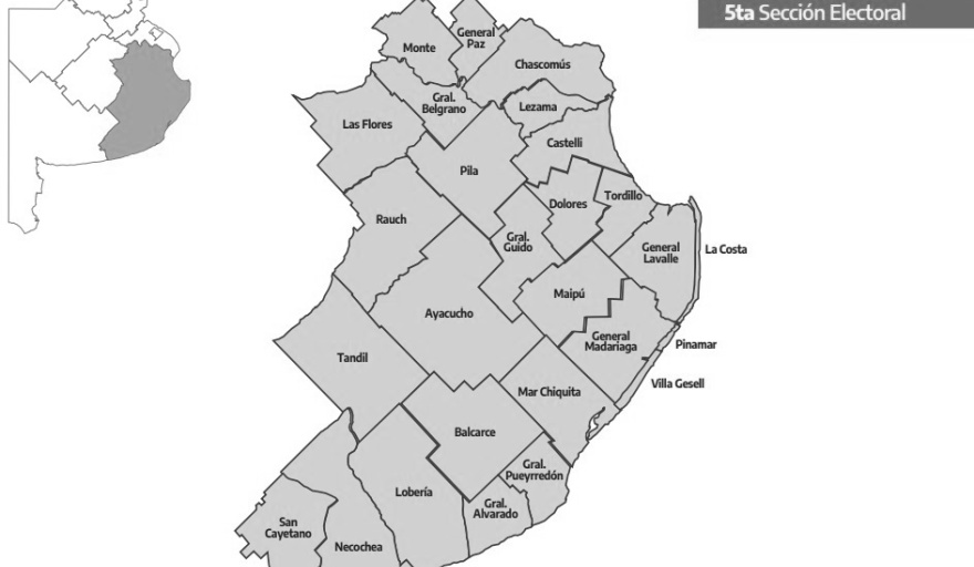En este sentido, irán a las urnas 1.336.787 electores en la Quinta sección electoral, que comprende los municipios de Ayacucho, Balcarce, Castelli, Chascomús, Dolores, General Alvarado, General Belgrano, General Guido, General Lavalle, General Madariaga, General Paz, General Pueyrredón, La Costa, Las Flores, Lezama, Lobería, Maipú, Mar Chiquita, Monte, Necochea, Pila, Pinamar, Rauch, San Cayetano, Tandil, Tordillo y Villa Gesell.