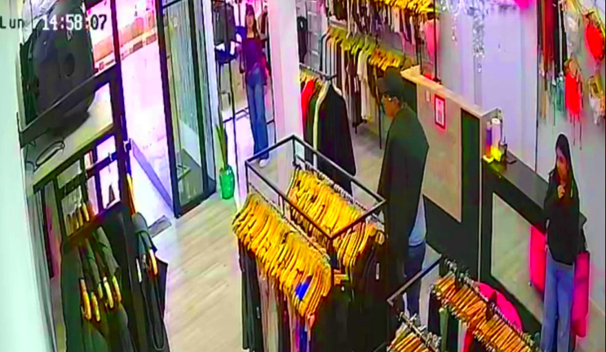 A continuación el sujeto observó las prendas colgadas en un perchero y luego se dirigió a las vidrieras ante las atentas miradas de las vendedoras.