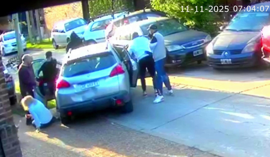 En el video se observa que el hombre sacó a la esposa con tirones de los brazos y la señora se sentó en la vereda sin poder moverse. En ese instante uno de los delincuentes le arrebató la cartera y momentos después escaparon a bordo de los dos vehículos.