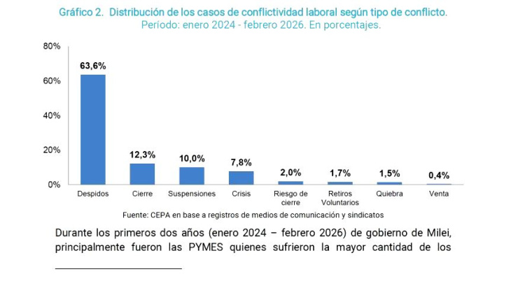 En cuanto a la modalidad de estos conflictos, los despidos conforman el 63,6% de los casos registrados en estos dos años. Los cierres de empresas representan el 12,3%, mientras que las suspensiones alcanzan el 10% y las crisis empresarias declaradas el 7,8%. El informe también subraya que entre noviembre de 2023 y octubre de 2025 se perdieron un total de 272.607 puestos de trabajo registrados en toda la Argentina.
