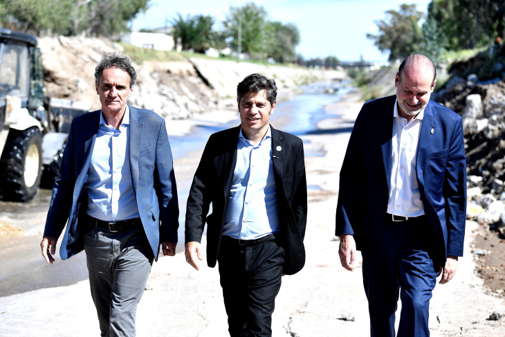 Uno de los puntos centrales de la recorrida fue la supervisión de la refuncionalización del Canal Maldonado, una obra hídrica histórica que permitirá triplicar el caudal de escurrimiento para evitar nuevas catástrofes climáticas. Junto al ministro de Infraestructura, Gabriel Katopodis, Kicillof visitó además la construcción del nuevo puente sobre calle Pampa Central, un proyecto de casi $3.000 millones.